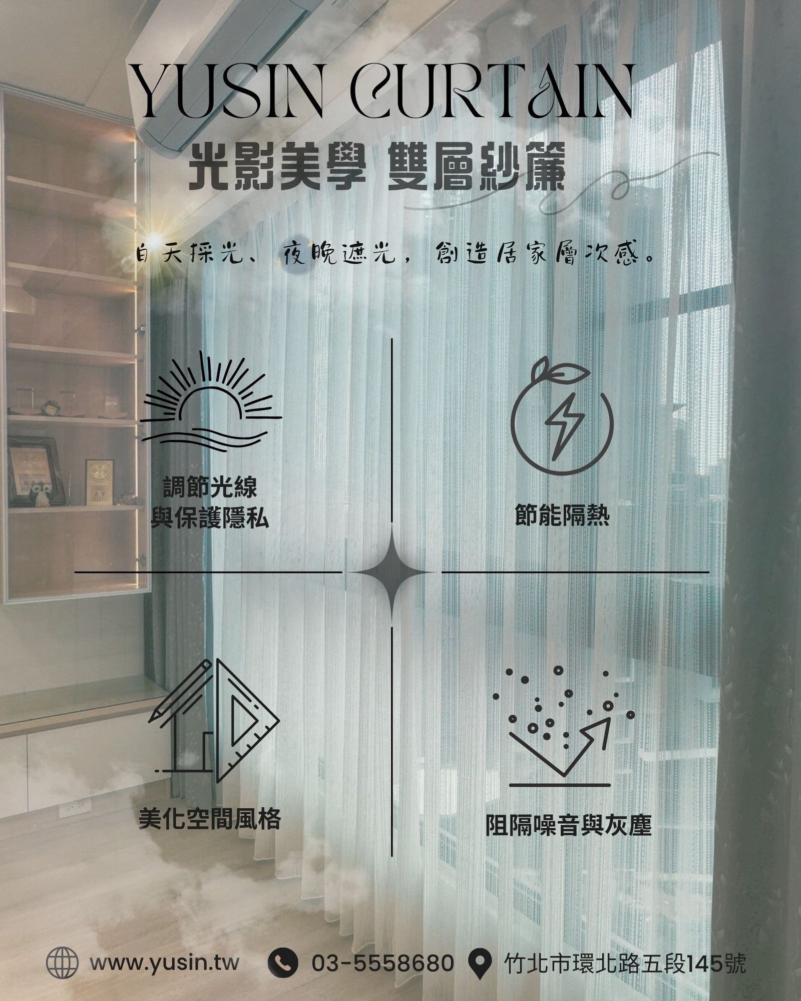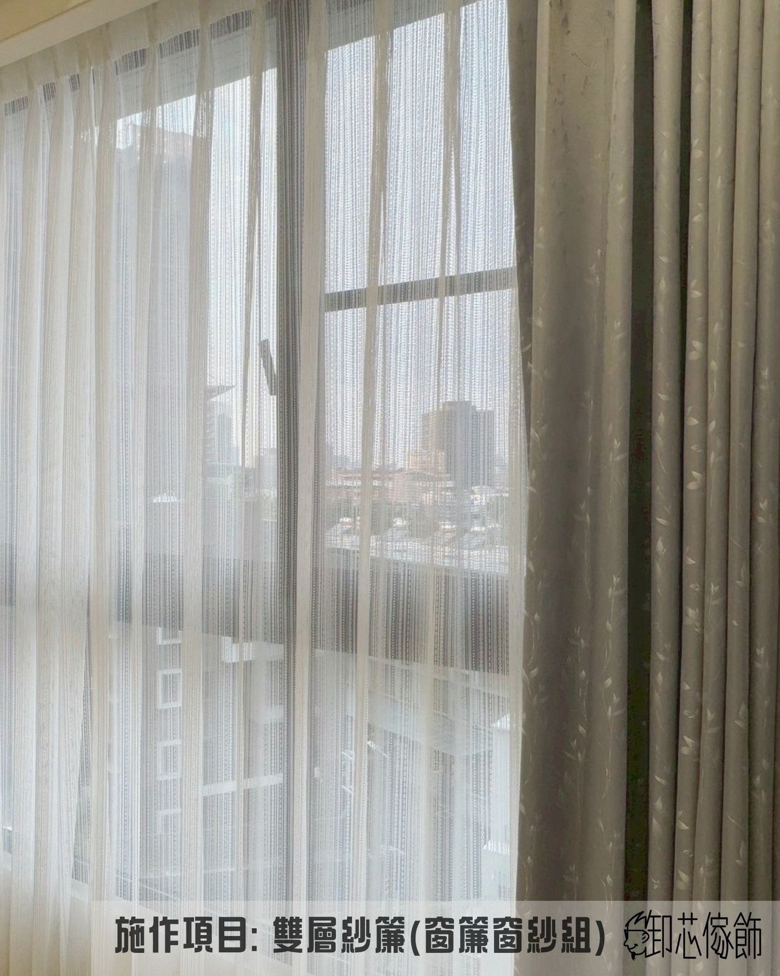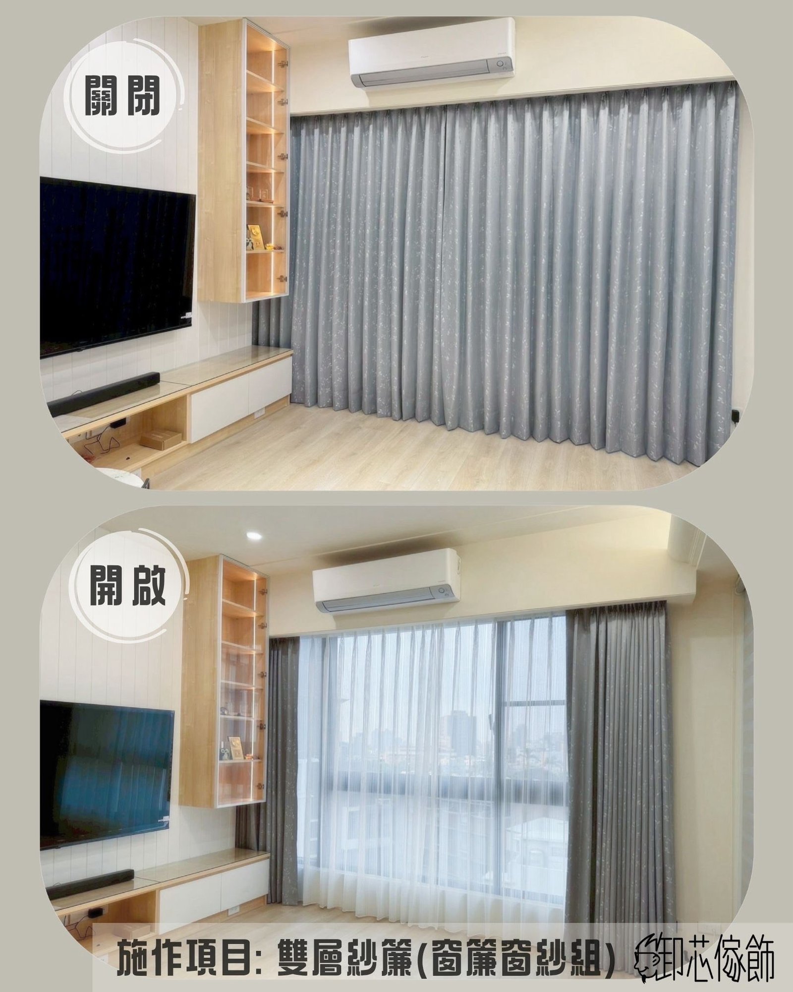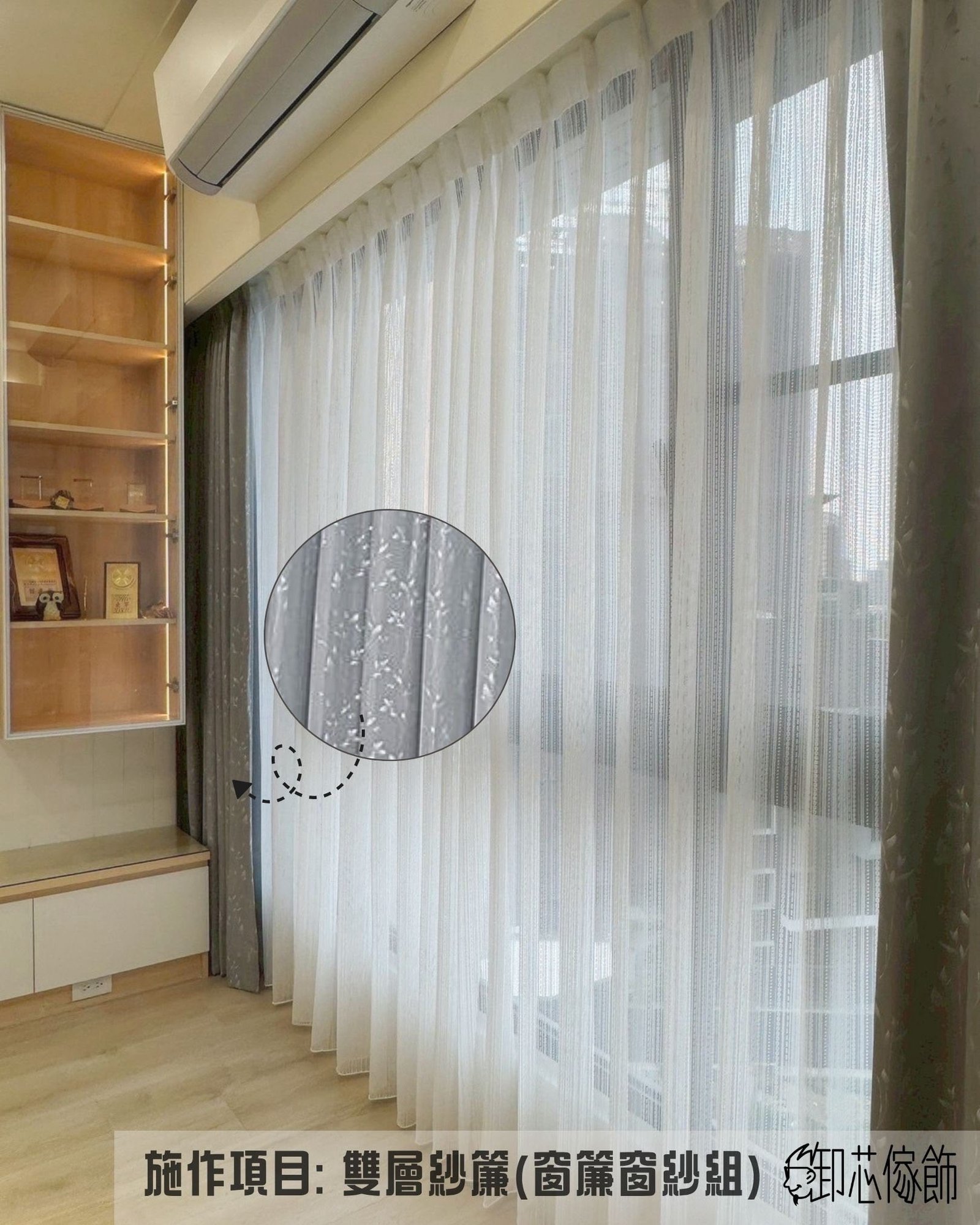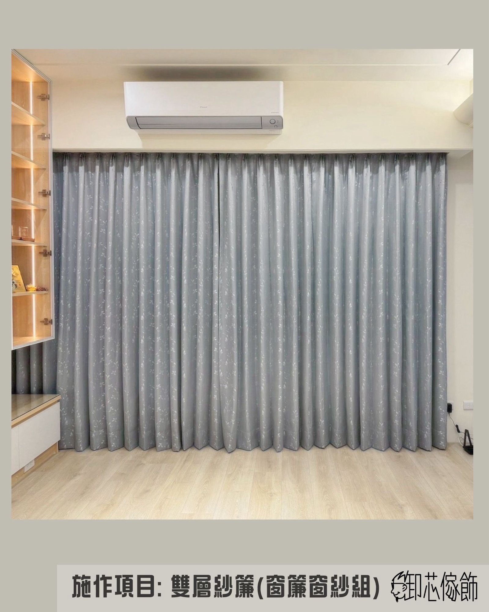 案例描述御用傢飾 深得您芯|御芯傢飾白天採光、夜晚遮光,創造居家層次感。—————————————–雙層紗簾(窗簾窗紗組):外層的灰色遮光布簾,表面織有低調精緻的暗紋花卉圖案,在光線照射下呈現出若隱若現的立體層次感,完美擺脫素色布簾的單調,為您的居家空間注入一絲浪漫與輕奢品味。內層的柔美白色窗紗,能將刺眼陽光轉化為溫和光線,讓您在白天也能享受自然採光與個人隱私。這套設計讓您能隨心所欲地調節光線、隔絕噪音,同時大幅提升客廳或臥室的設計質感與居住舒適度。