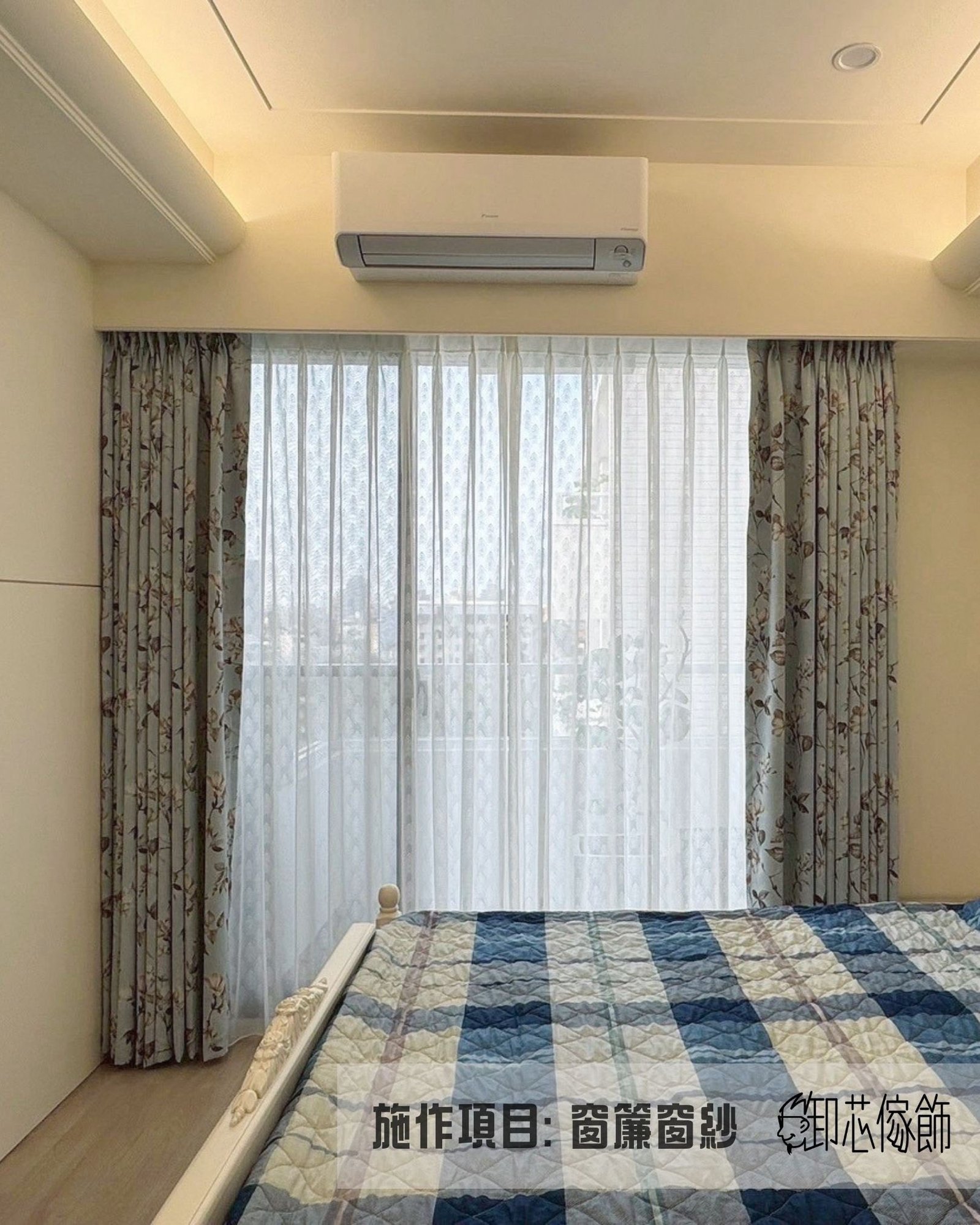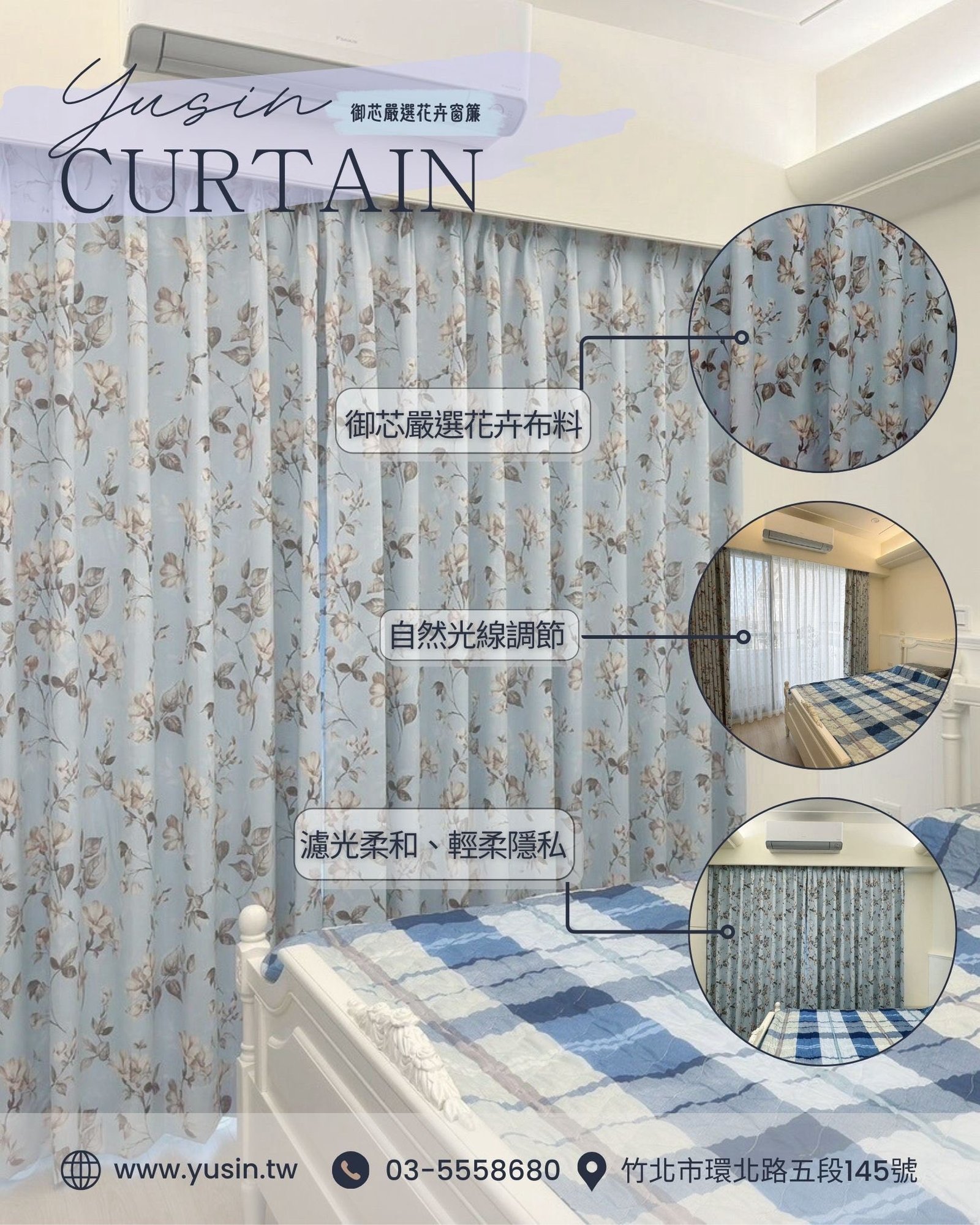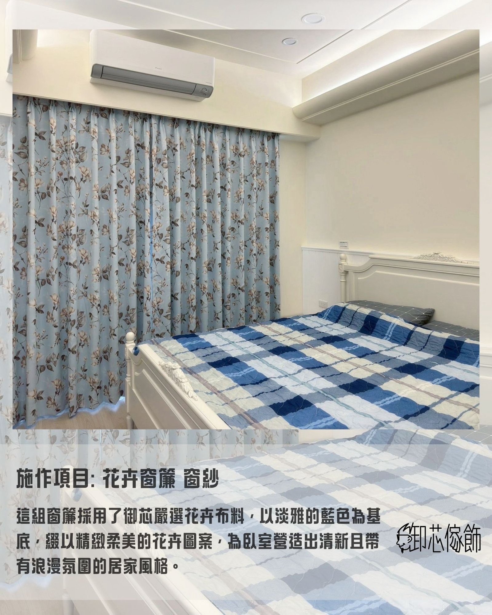 案例描述御用傢飾 深得您芯|御芯傢飾—————————————–花卉窗簾、窗紗:精選御芯嚴選花卉布料,以淡雅的藍灰色調搭配復古細緻的浪漫花卉圖案,營造出寧靜且精緻的居家風格。功能上,它具備自然光線調節和恰到好處的遮光性,同時保有輕柔隱私,讓您的休憩空間兼具美感與實用。