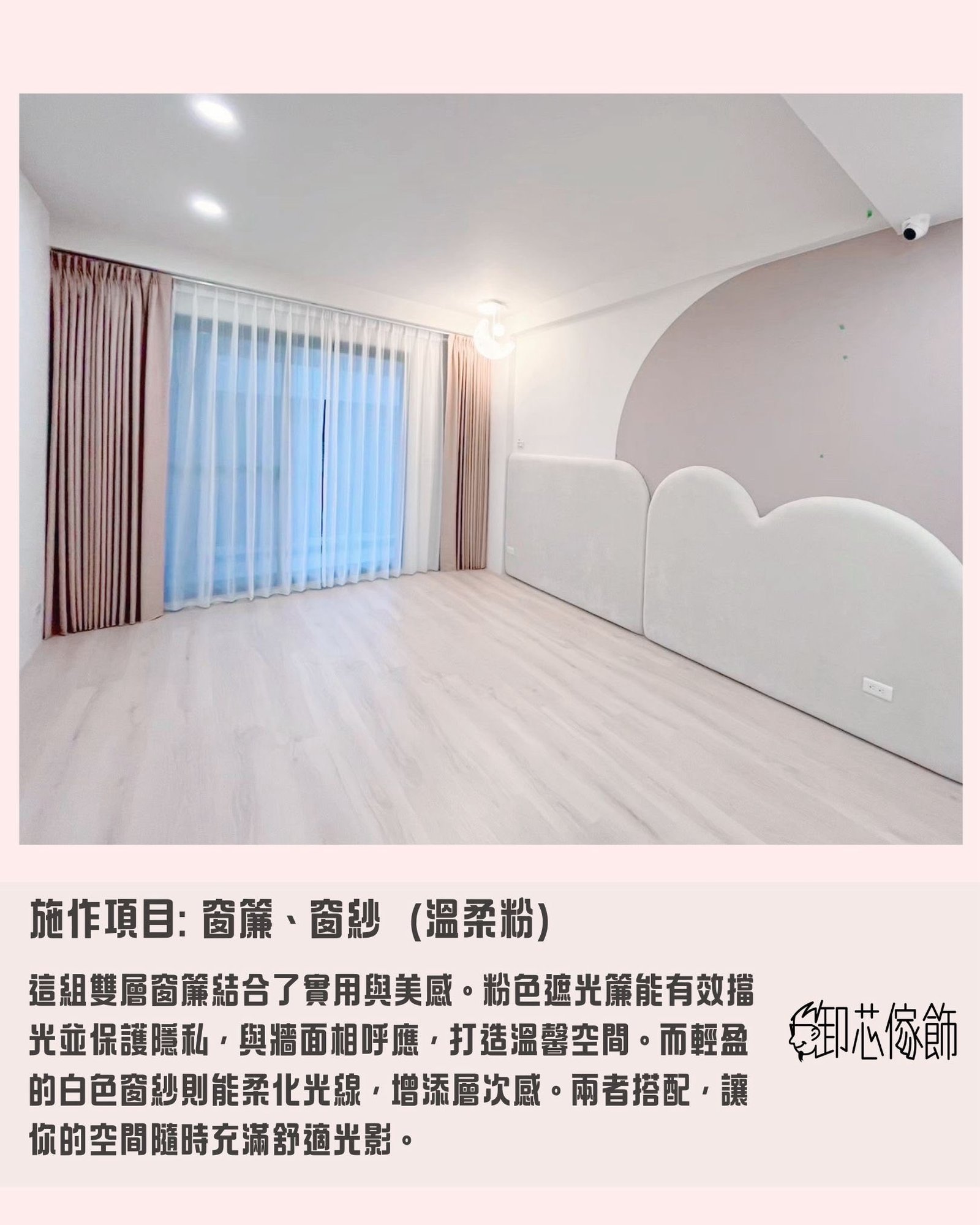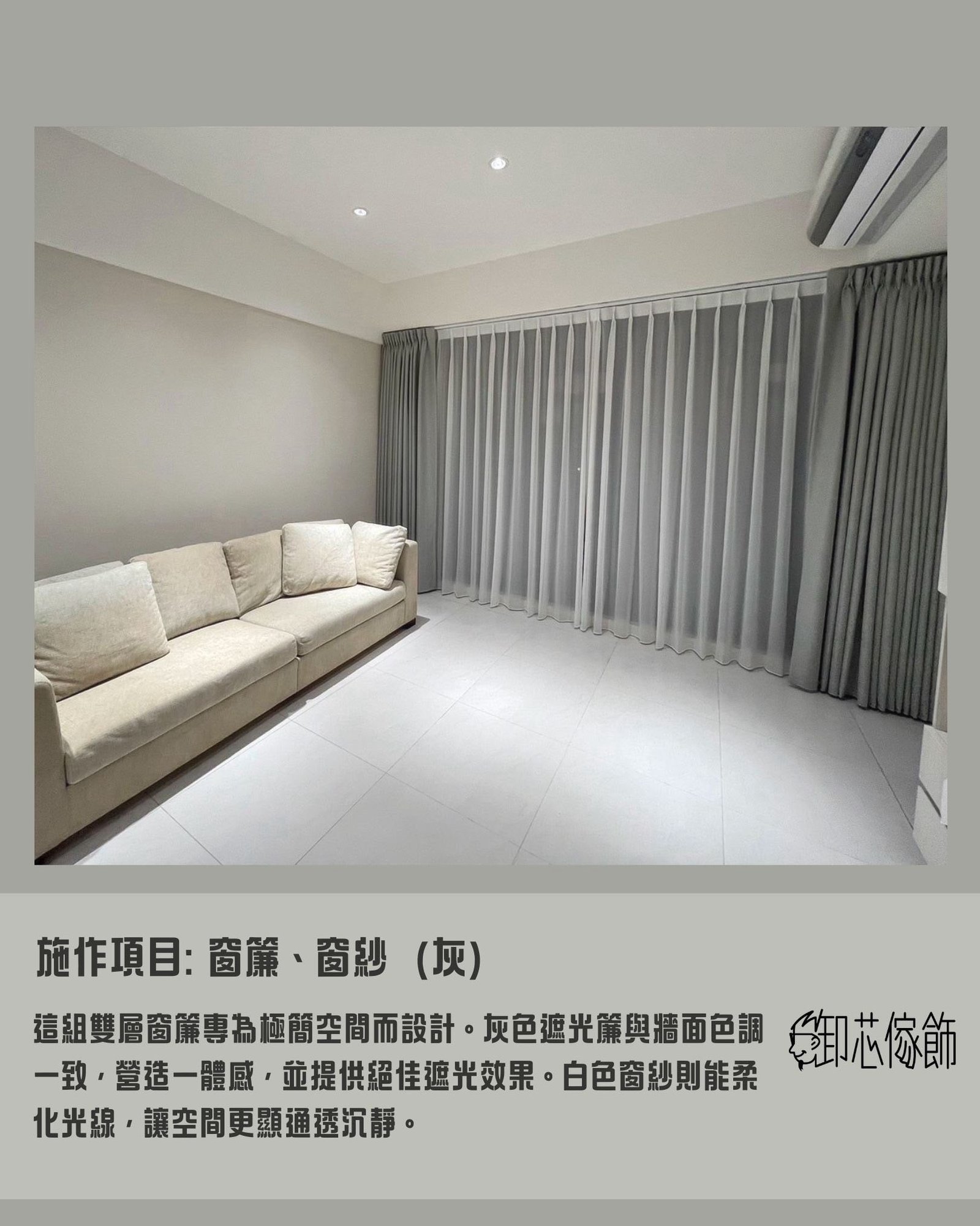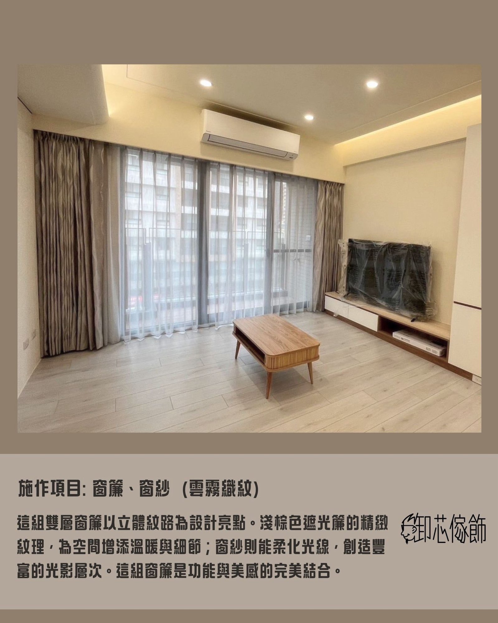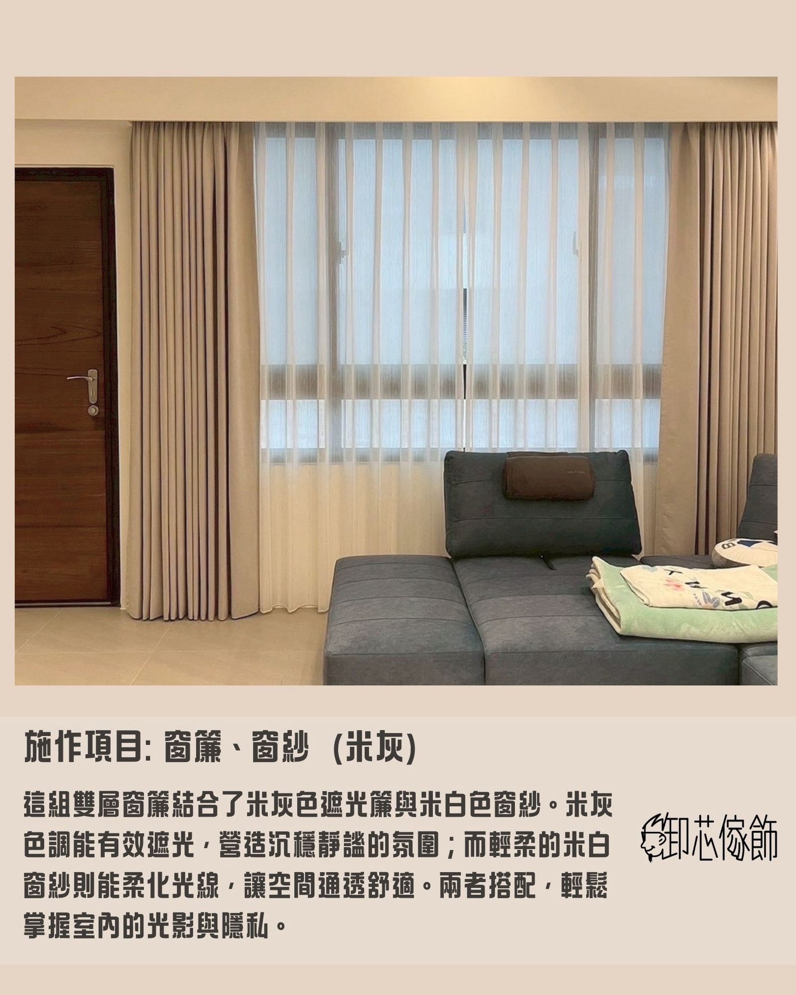 案例描述御用傢飾 深得您芯|御芯傢飾想要隱私,又想透光?雙層窗簾一次到位,生活品質不打折。—————————————–窗簾、窗紗想打造高質感的居家空間?窗簾與窗紗是你的最佳選擇!遮光簾能有效阻擋光線、保護隱私,給你一個安穩的休息環境;窗紗則能柔化日光,讓室內充滿溫暖的自然光。兩者搭配,輕鬆切換光線模式,為你的家創造專屬的光影美學。—————————————-